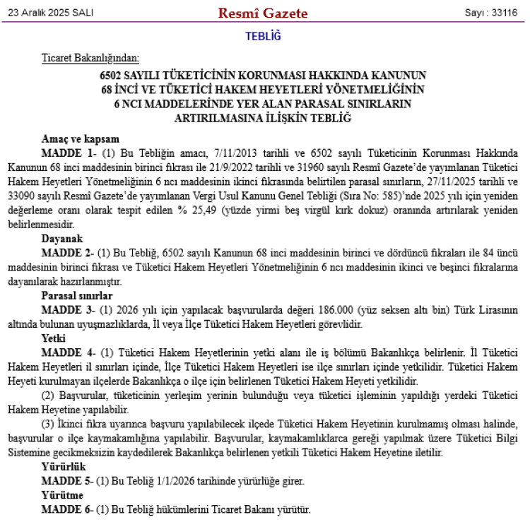 Buna göre, 2026 yılında Tüketici Hakem Heyetlerine yapılacak başvurularda, uyuşmazlığın değeri 186 bin TL’nin altında ise İl veya İlçe Hakem Heyetleri yetkili olacak.